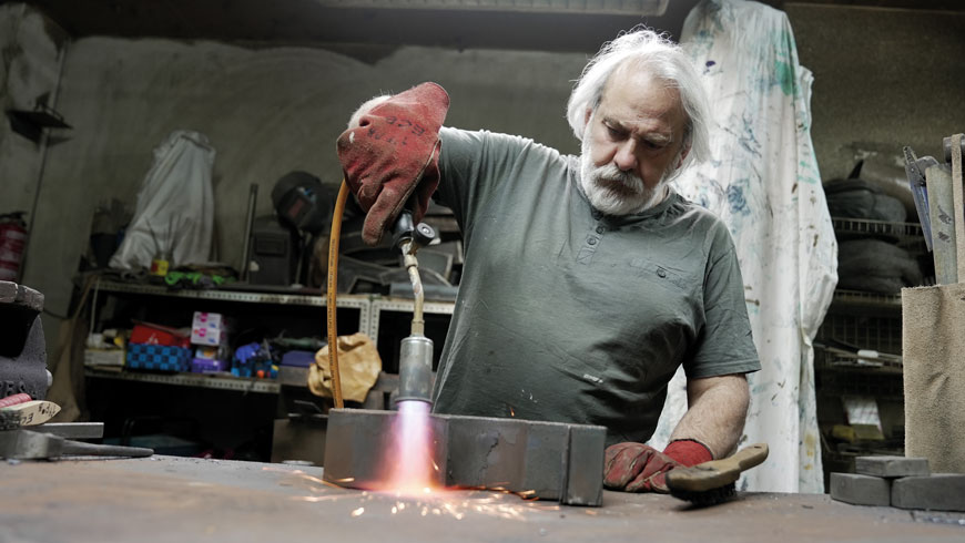Utilizo una amplia paleta de colores, pero predominan los negros, blancos y azules, aunque también el del acero cortén, que uso frecuentemente y que toma esos tonos rojizos y cálidos como el fuego.